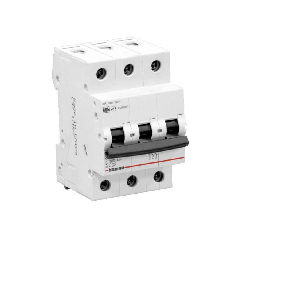 Interruptor miniatura de tres polos en montaje riel din. Con el propósito de cubrir todas las necesidades particulares de aplicación, la gama de interruptores BTDIN está disponible con curvas de intervención C cuyas características constructivas ofrecen una respuesta de disparo térmico y magnético. Garantizan la protección efectiva de la instalación en un breve lapso de tiempo de solo 0.004 segundos para 10 veces la corriente nominal (curva tipo C).